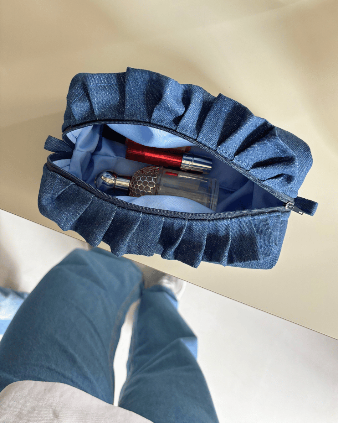 Kosmetyczka z jeansu ozdobiona uroczą falbaną – bo nawet najmniejsze rzeczy zasługują na piękną oprawę. Dodaje uroku nawet codziennym rytuałom pielęgnacyjnym. Jest pojemna, miękka, poręczna – idealna do wrzucenia do torby, walizki, plecaka. Ale równie pięknie wygląda na łazienkowej półce, wśród minimalistycznych flakoników. Urocza, praktyczna i ponadczasowa.