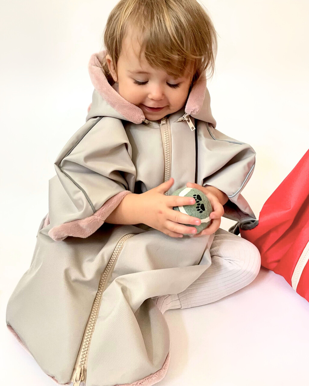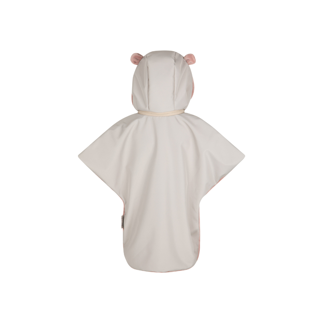 - Wodoodporna zewnętrzna warstwa, która chroni dziecko przed deszczem, śniegiem, wiatrem. Środek poncza wykonany z miękkiego i ciepłego futerka.