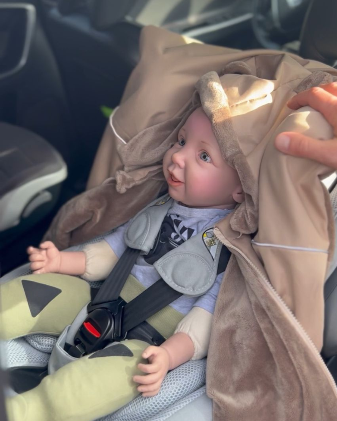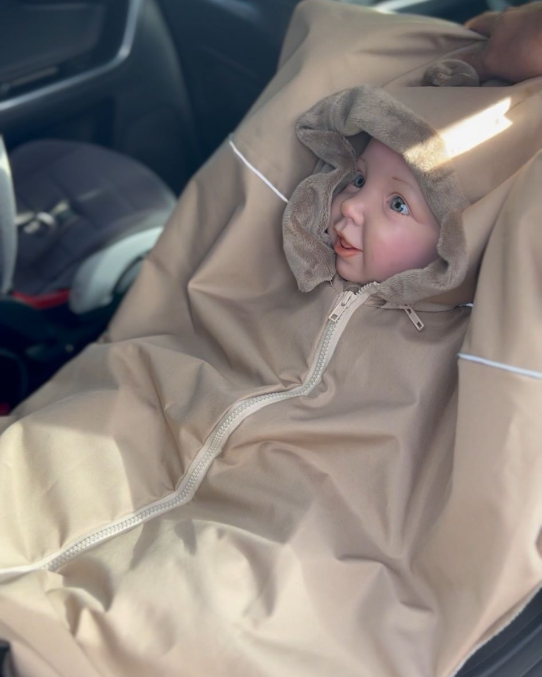 - Tylną część poncza podciągasz na tylną, górną część fotelika na czas podróży w samochodzie- pasy bezpieczeństwa zapinasz pod ponczem, bezpośrednio na dziecku.