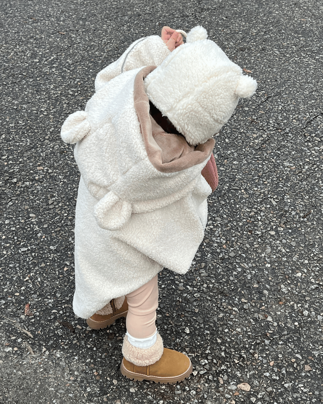- Tylną część poncza podciągasz na tylną, górną część fotelika na czas podróży w samochodzie- pasy bezpieczeństwa zapinasz pod ponczem, bezpośrednio na dziecku.