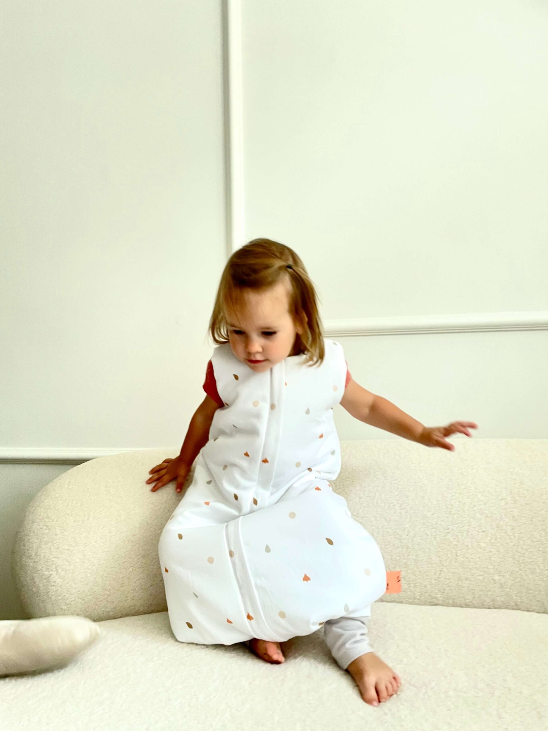 Co w nim takiego genialnego? Komfortowy krój dający Maleństwu pełną swobodę ruchów. Dzięki nogawkom dziecko bez problemów będzie mogło wstać w śpiworku i swobodnie się w nim poruszać. Brak rękawków, żeby nie ograniczać stałego dostępu powietrza. Wygodny dwustronny suwak pozwala rozpiąć suwak również od dołu, co jest pomocne podczas nocnego przewijania dziecka.